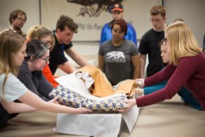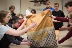 While some students gingerly folded the banner, some placed acid-free tissue paper in the folds and others monitored the painted stars for signs of stress or flaking. They worked to prepare it for long-term storage in a larger, archive-quality box.
