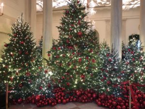 This years White House holiday theme is American Treasures, with 50 live Christmas trees featuring 14,000 red ornaments and 40 berry topiaries ranging in size from three to 12 feet.