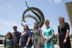 From left are Old Town Cape Executive Director Marla Mills; Chris Wubbena, Southeast professor of sculpture; student artist Heather Meadows; Becki Harding and Lori Fowler, owners of Area Properties Real Estate; and Brianna Biri, agent with Area Properties Real Estate.