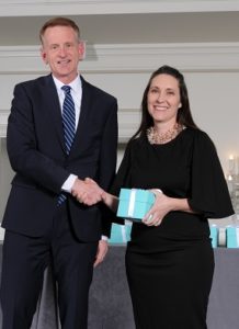 2001 Southeast graduate Cassie Peterein receives the Emerson Excellence in Teaching Award from David Rabe, Emerson vice president of corporate social responsibility.