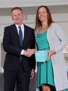Southeast graduate Amy Sheehan receives the Emerson Excellence in Teaching Award from David Rabe, Emerson vice president of corporate social responsibility.