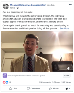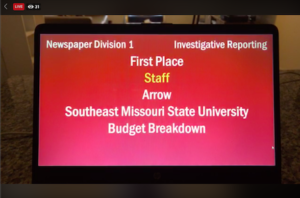 The Arrow, the student newspaper of Southeast Missouri State University, won 18 awards while hosting the 2020 Missouri College Media Association (MCMA) Awards Ceremony.[caption id="attachment_35618" align="alignleft" width="238"] Zach Tate, Arrow editor,hosts the Missouri College Media Association'sFacebook Live virtual awards ceremony.[/caption]This years contest was scheduled to be held at Southeast April 3-4, but due to the COVID-19 pandemic, Southeast organizers and members of the MCMA executive committee shifted the two-day conference to a Facebook Live virtual awards ceremony on April 7.Among the Arrows awards were four first-place awards, six second-place awards, five third-place awards and three honorable mentions.I believe our wins reflect our students' ability to tell stories across platforms, said Dr. Tamara Zellars Buck, faculty advisor to the Arrow and multimedia journalism coordinator in Southeasts Department of Mass Media. Specifically, we were recognized for photojournalism; in-depth, investigative, sports and feature writing; page design; and multimedia storytelling. Our students are able to learn and practice journalism in all of its forms, and they're able to specialize their talents on a daily basis via the Arrow.The Arrows special report titled Budget Breakdown earned two first-place awards in Investigative Reporting and Special Section or Supplement. Budget Breakdown was a special report detailing the Universitys budget over the past five years, and was produced as a special project by students in the Media Management course to showcase the skills of advertising and journalism majors.[caption id="attachment_35619" align="alignright" width="300"] The Arrows special report titled Budget Breakdown earned two first-place MCMA awards in Investigative Reporting and Special Section or Supplement.[/caption]Our Budget Breakdown special report was such a huge collaborative effort, and I am so happy that we were recognized for it, said Zach Tate, Arrow editor. There was a lot of hard work and dedication put into that, and I have to tip my hat to Dr. Buck and professor Mike Simmons. They pushed our students from day one in the fall, and without them, it's hard to say what the result would have been. They put the pressure on, and our students responded with award-winning work.Buck agreed, adding The ad students did a great job developing a marketing plan that drew interest in the report. The multimedia journalism students, led by the Arrow editors, worked diligently to make the numbers make sense to our broad and diverse audience. It was an important special report that was highly read by our audience, and I'm glad that students were recognized for the work they put into it.The Arrow also continued to dominate in the Campus Engagements/Promotions category, taking second for What's Up SEMO?, third for First Amendment Day, and an honorable mention for the Shoeboxes of Caring service project.Multiplatform promotional capacity is a mandate in today's media, and Ibelieve our professional partnership with Rust Communications has enabled the Arrow to be a vanguard in this area, Buck said.I'm grateful for their leadership team's assistance in mentoring our studentsas they engage in digital promotion and executing live events.Additionally,the First Amendment Day and Shoeboxes of Caringprojects were also facilitated by the Media Management class.[caption id="attachment_35620" align="alignleft" width="300"] Among the Arrows notable wins was a second-place Best Overall Newspaper honor.[/caption]This course was conceived as an opportunity for advertising and multimedia journalism students to learn from each other through collaborative projects for the Arrow as a client, and the recognition of the students in these contests demonstrates the strength of experiential learning within our department, Buck said.Among the Arrows notable wins was a second-place Best Overall Newspaper honor. All student media organizations could compete in this category, regardless of size, by submitting one fall print issue, one spring print issue and a third issue from either semester.This honor recognizes the consistent production of quality journalism, Buck said. As Arrow advisor and multimedia journalism coordinator, I'm proud of the Arrow staffers for buying into my vision of student-led learning in a student-run lab. The recognition is proof that it works, and it only works because our students believe in the concept.The awards also reflect the Arrow staffs efforts to achieve digital-first status this year, which have been great preparation for continuing to work during the COVID-19 pandemic.We've been holding weekly videoconference meetings since August, and the bulk of our production is generally done remotely, said Buck. That means it's been business as usual for us, with the exception of having our larger staff meetings via Zoom rather than in person.The Arrow staff are working remotely for the remainder of the spring semester. To help with the pursuit of stories and to ensure they have content to produce, the staff developed digital desk shifts -- looking for stories by combing through social media and websites that are relevant to their audience.During this time, media professionals are essential workers, said Tate.This applies to us as student media professionals as well -- we're all working remotely from our homes, and searching for content that our audience needs to see, and also wants to see he said. Our goal has been to keep our audience updated on everything COVID-19-related and University-related, and also to entertain our audience and distract from some of the negativity in the world.The toughest part as been finding great stories to tell when they can't talk with people face to face, and adjusting to the shift and really knowing where to search for potential stories.I think over time, and with more instruction from both myself and Dr. Buck, our reporters and staffers have been able to find their